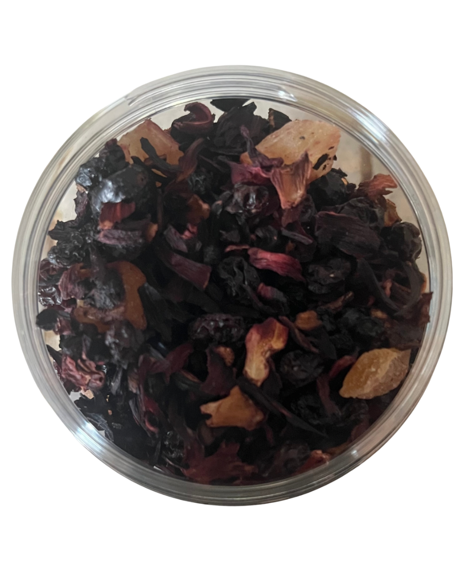 Ingredienti: fiori di ibisco, uva passa, bacche di sambuco, pezzetti di ananas candito (ananas, zucchero), aroma, ribes nero, lamponi (0,5%), pezzi di amarena (0,5%).